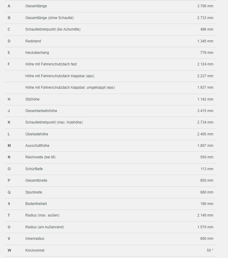 Technische Daten "Knickradlader, Typ 1140 CX30"