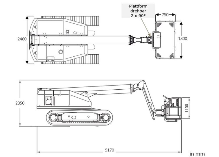 - Die Teleskopbühne ist dank der Raupenketten und dem starken Dieselmotor, für jedes Gelände gemacht.